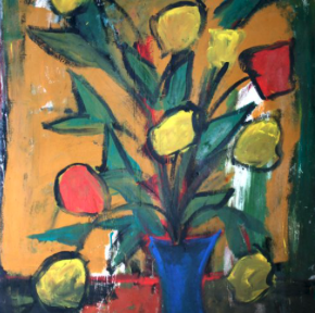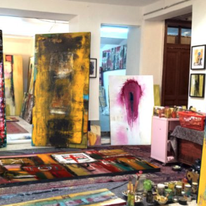 Bei längerer Betrachtung seiner großflächigen Exponate ergeben sich immer wieder andere Gestalten, sein Leitmotiv „living with colours“ drückt sich durch teilweise sehr kräftige Farb-kompositionen aus.