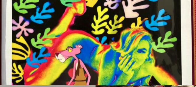 Ein zentrales Motiv ist die Hommage an den rosaroten Panther, der aus einem Filmvorspann zu einer der bekanntesten Zeichentrickserien wurde. Besonders im deutschsprachigen Raum war diese Serie geprägt von Gert Günther Hoffmanns humorvollen Kommentaren, die durch übertriebene Vergleiche und ironische Bemerkungen die Handlung erweiterten. Ähnlich geht der Künstler vor, indem er bestehenden Szenarien einen neuen, oft humorvollen Blickwinkel verleiht.